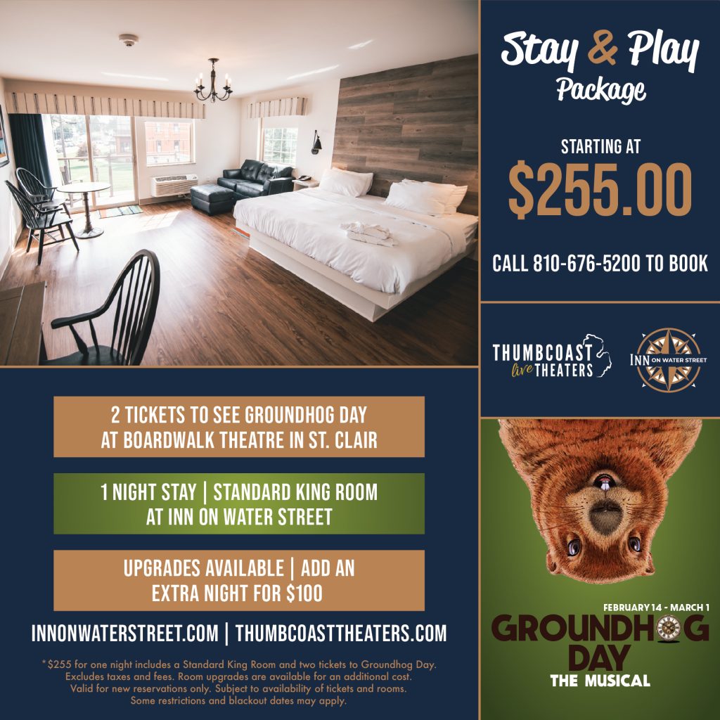 Starting at $255 and includes 2 tickets to see Groundhog Day at Boardwalk Theatre in St. Clair and 1 Night Stay in Standard King Room at the Inn. Upgrades for an extra night are available.