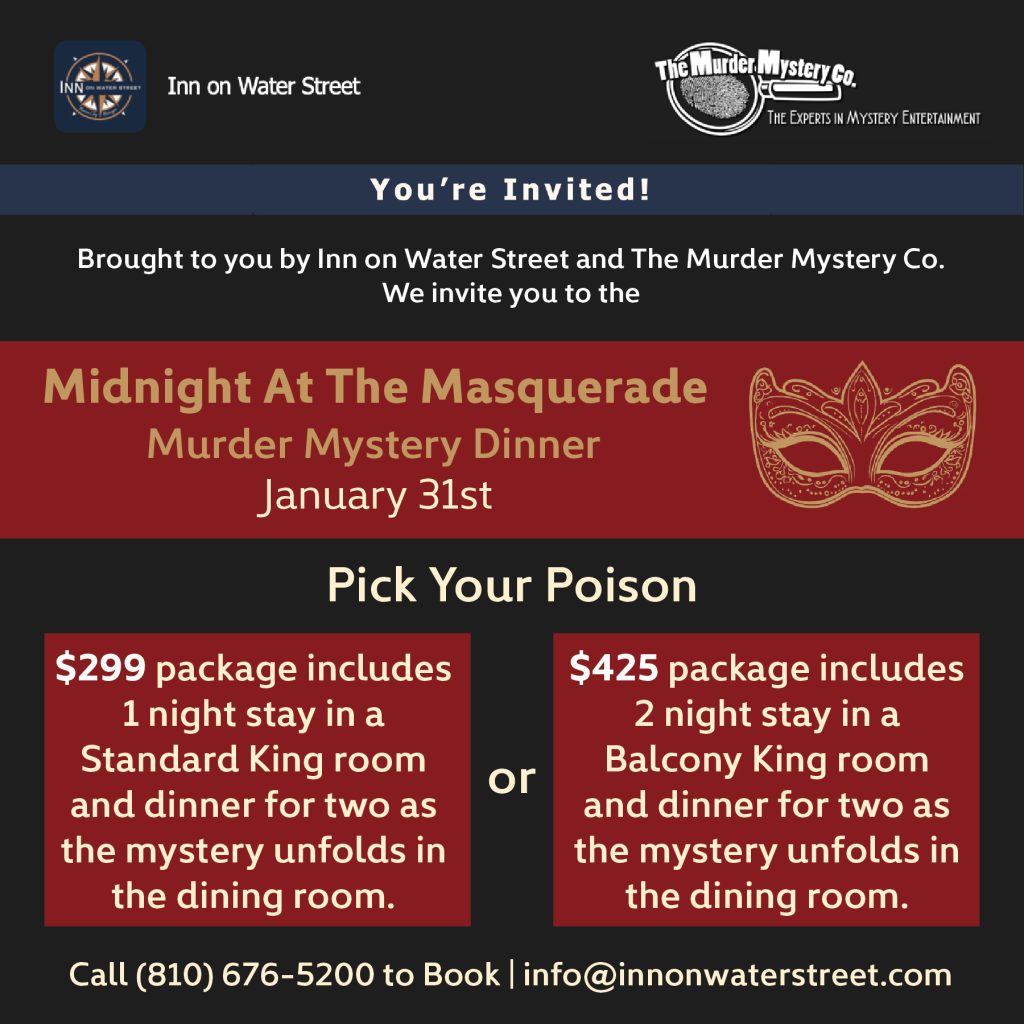 $299 package includes 1 night stay in Standard King room and dinner for two as the mystery unfolds in the dining room.